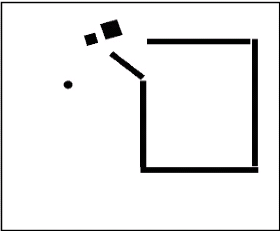 Big square, Small square, and Circle are actors in this movie created by psychologists. This is a scene which people often describe as "The large square is hitting the small square". Other scenes may be described as "The large square corners the circle and is threatening her."