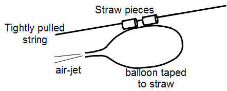 Inflate and Blast off!! First, you need to stretch a long string across a large space. Try to make the ties at each end fairly easy to open - this can be done by winding them four times around a nail. Next, you inflate the balloon and tie up the mouth. Then you cut a long tube from the drinking straw, scotchtape it to the balloon near the ends, and cut off the middle part. Put the string through the straw pieces, and open the mouth of the balloon: presto - your missile will sails across the room.