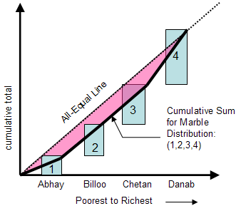 The Gini index looks at the shaded area between the all-equal line and the cumulative-sum curve. In perfect equality, this area is zero. In perfect inequality, everyone has zero except the richest, so this area is the whole triangle under the line, 100%. For our marble players, this cumulative-sum area is 15 and the area under the triangle is 20, so the ratio is (20-15)÷20 or 25%. [Storytelling Idea: Have your kids cut straws of length 1,3,6 and 10.] In our group of boys, the bottom 25% (Abhay) has 1 marble, 50% have three marbles, 75% have six and all 100% have ten. So our cumulative-sum curve is running beneath the all-equal line (in fact this distribution has a Gini index of 25, about the same as Japan). The more the area between this cumulative sum and the all-equal line, the higher the disparity. The Gini index is the percentage ratio of this area divided by the triangular area under thea line.