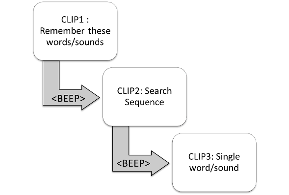 The experiment consists of a practice test followed by 15 test trials. The practice test is added to get the subject acquainted to the test and to the accent involved in the test. There are 3 categories in the test each further being divided into 5 different kinds of test trials. The test consists of clip1 which contains words or sounds to be remembered, followed by a beep, this being followed by clip2 which is a search sequence and then a beep followed by a single word or sound. The subject has to identify whether the last word/sound in the entire audio was contained in clip2 i.e. the search sequence or not by pressing a yes or a no button correspondingly. Finally, the subject is asked to recall the words/sounds of clip1 that were to be remembered.