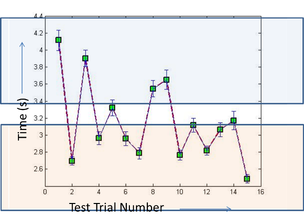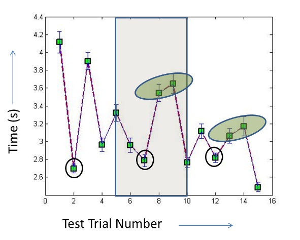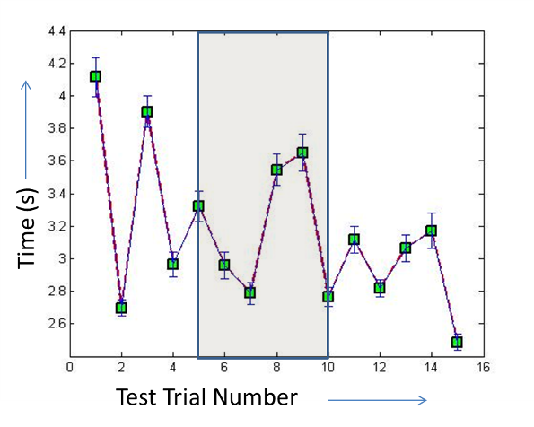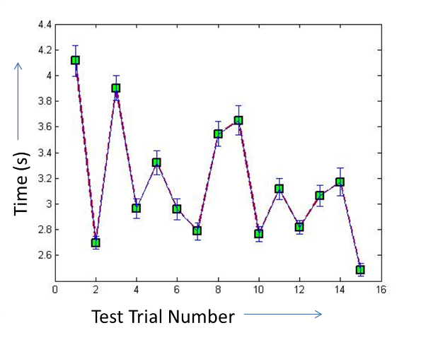 Figure4. Plot of response time in seconds versus the test trial number averaged for all the 12 subjects showing the significant difference in response times across various test trials